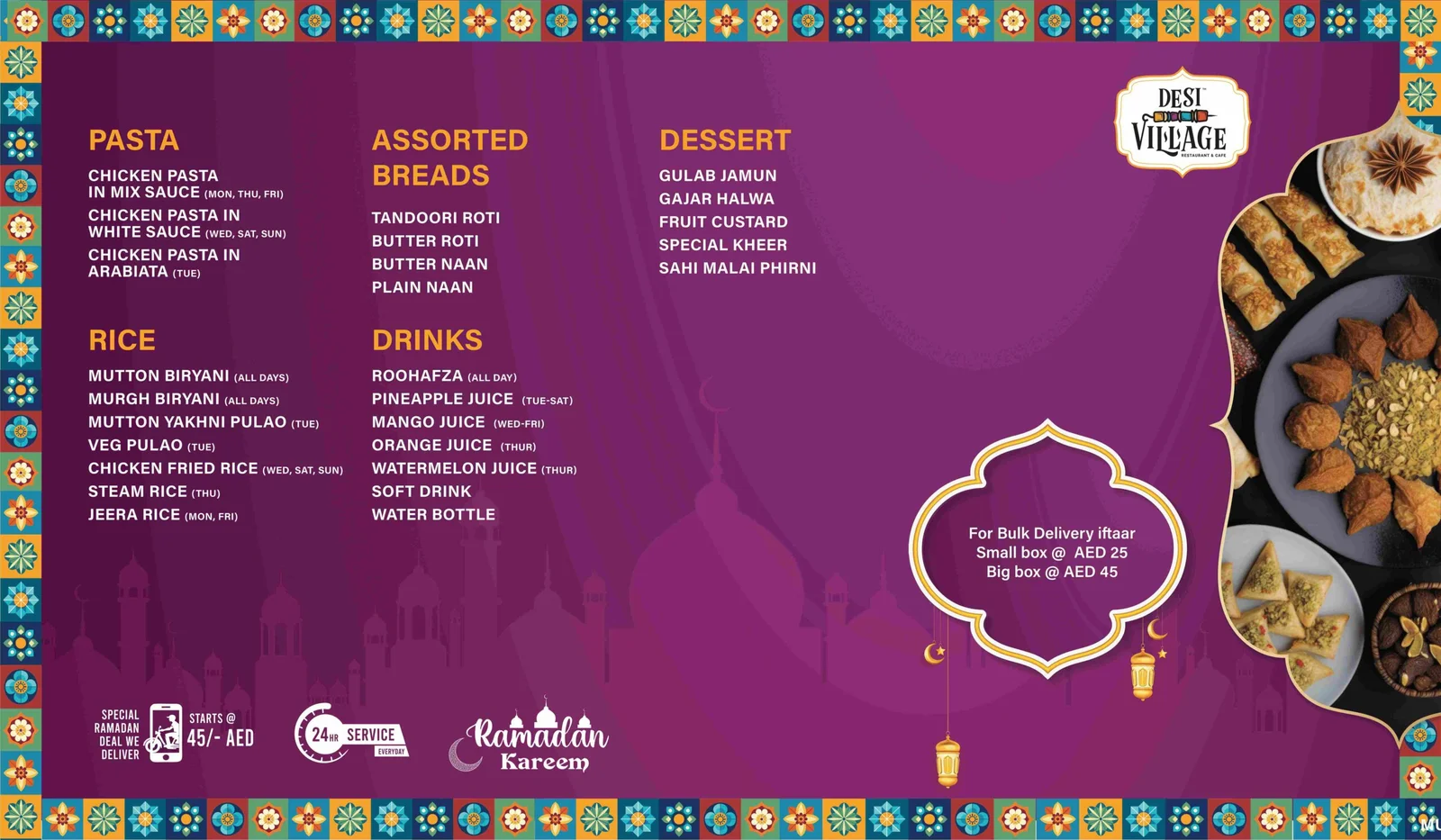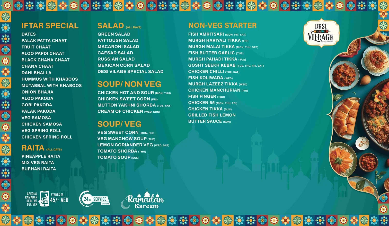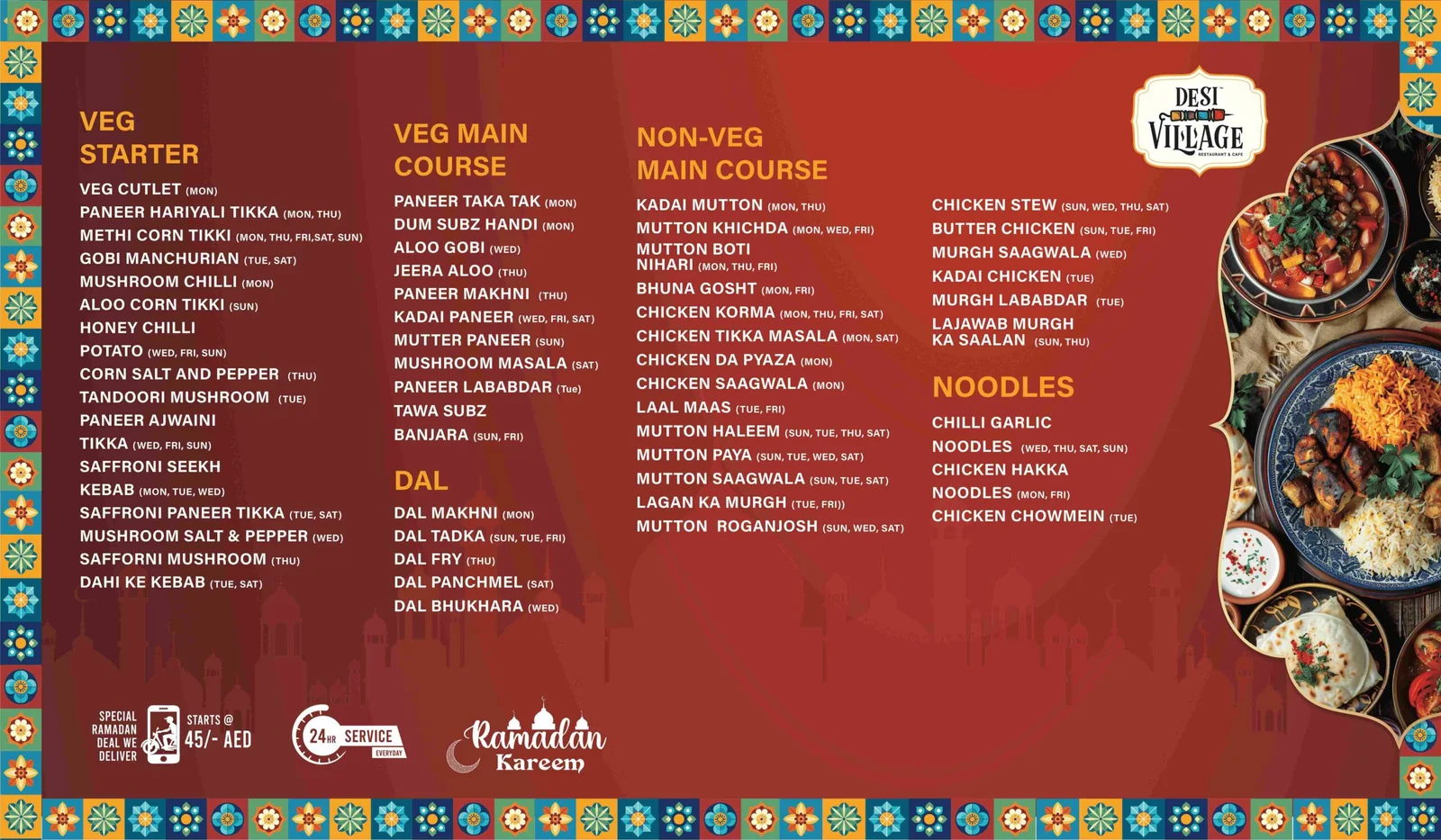 We believe the ambiance plays a vital role and adds up to the pleasure of dining. This clearly reflects in our designs & interiors right from the moment you step inside Desi Village. One of the finest and most picturesque restaurants in Dubai, where exhudes charm through its chic interiors